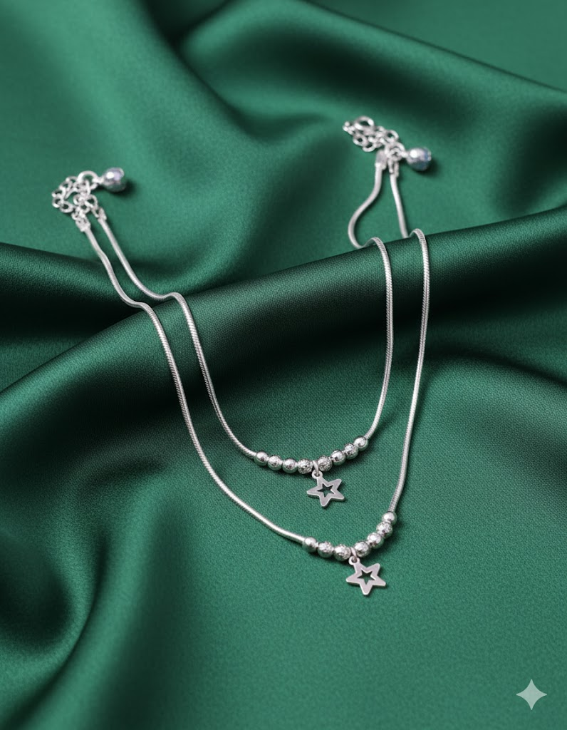Delicate and charming, these silver anklets are designed to add a touch of playful elegance to every step. Featuring fine snake chains accented with polished silver beads and a graceful star charm, they bring together minimal design and youthful sparkle. Perfect for everyday wear or subtle festive styling, these anklets effortlessly complement both traditional and contemporary looks.