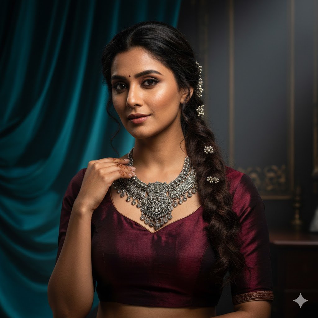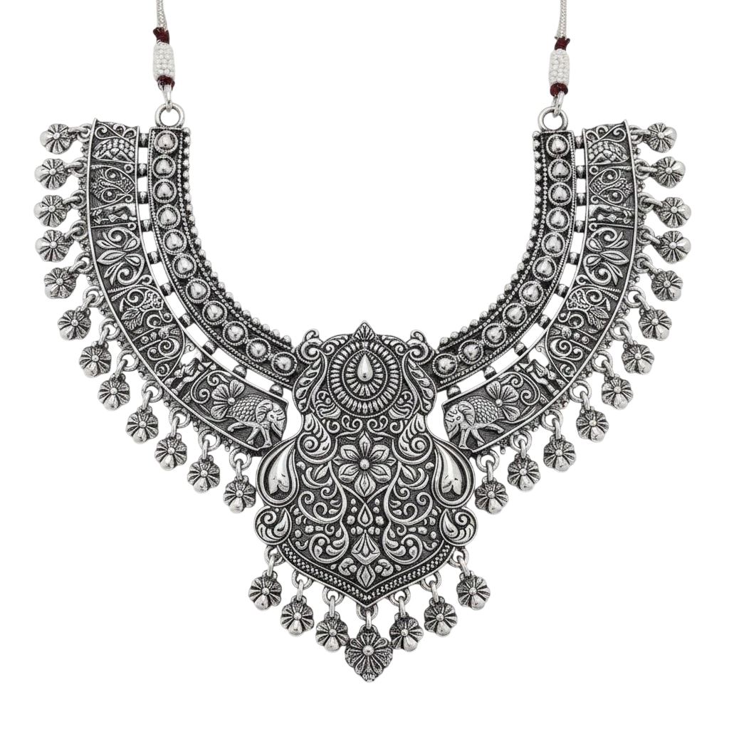 Every curve and charm reflects expert silverwork: from floral drops to an ornate central pendant, this necklace brings royal elegance to your look. Ideal for pairing with sarees, lehengas, and festive outfits, it brings out the true essence of Indian ethnic fashion.