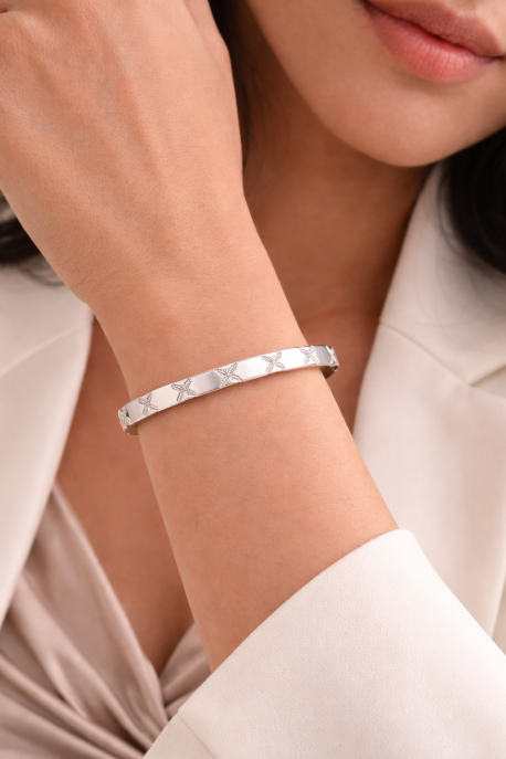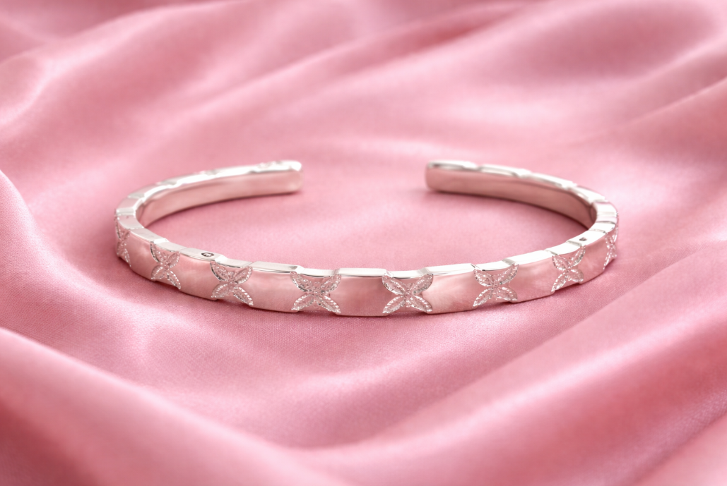 Refined and contemporary, this sleek silver cuff bracelet features a beautifully engraved floral pattern that adds a delicate touch of artistry to its clean silhouette. The polished surface reflects light effortlessly, while the subtle motifs bring a sense of grace and femininity to the design. With its openable structure, the bracelet ensures ease of wear and a comfortable fit. Perfect for both modern and Indo-western styling, it is a timeless accessory that complements every occasion with understated charm.