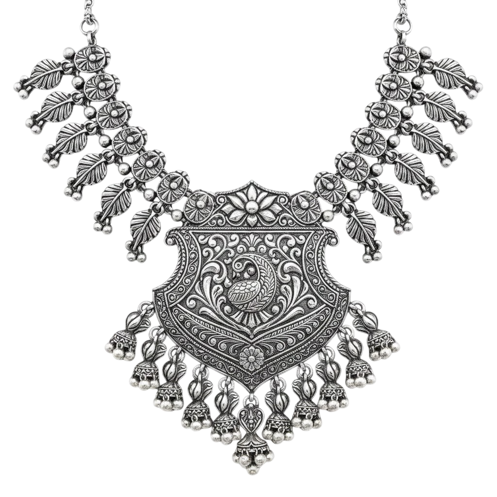 Add regal charm to your jewellery collection with this handcrafted 925 sterling silver traditional Indian necklace. Designed with intricate heritage engravings and delicate floral danglers, this necklace reflects the richness of Indian culture and fine silver artistry.
