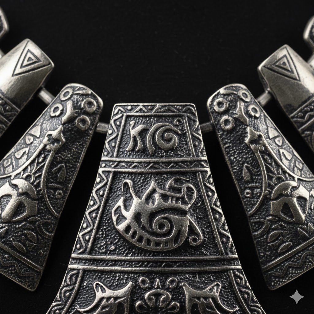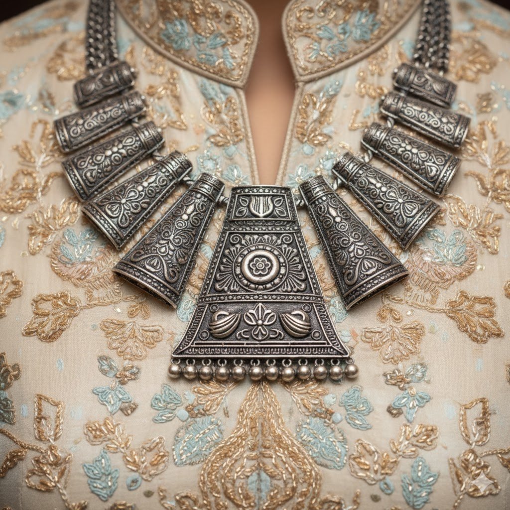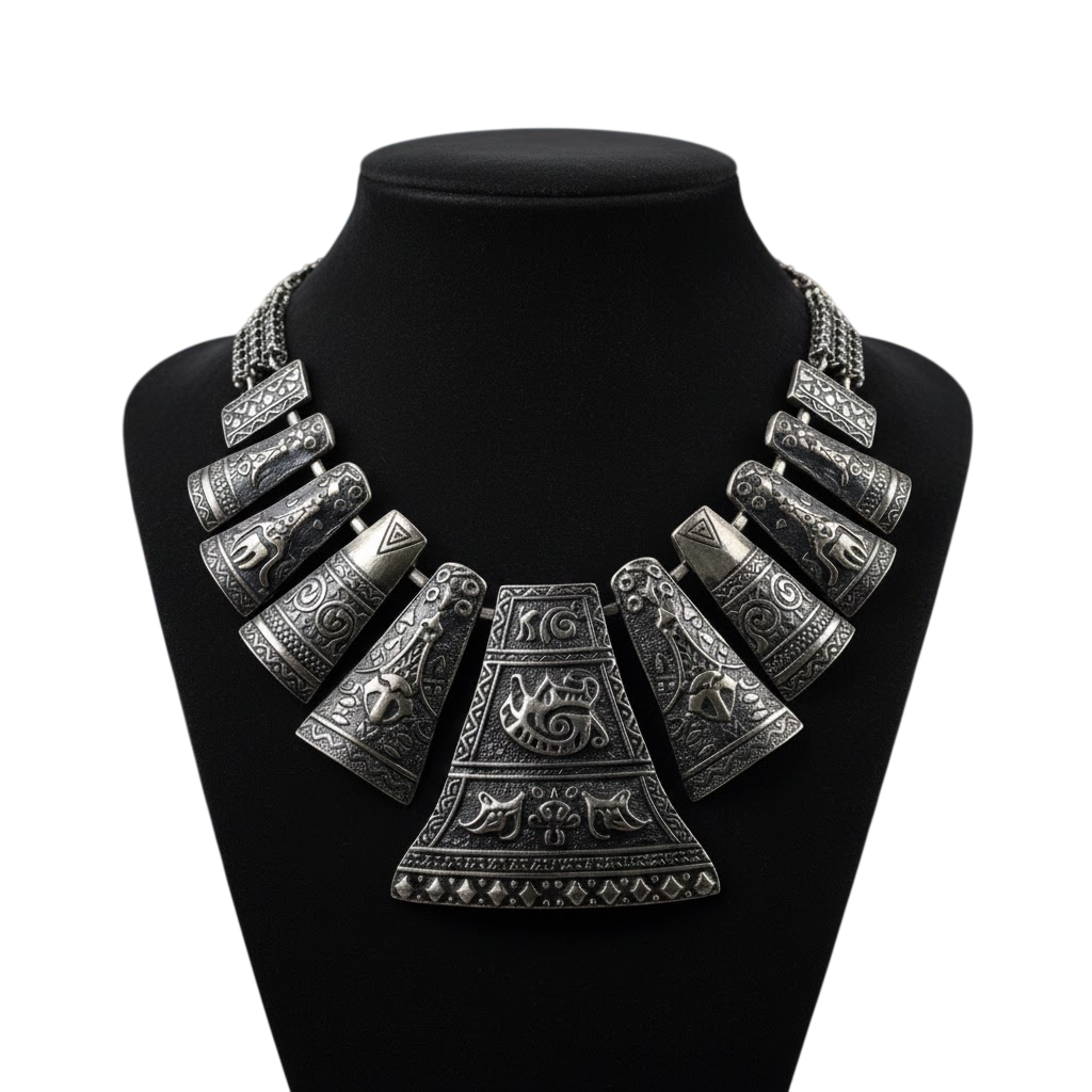 The necklace showcases multiple engraved silver segments and a large central statement pendant, giving it a strong, royal, and ethnic appearance. The dark oxidized tone enhances the depth of the carvings, making it ideal for women who love bold traditional jewellery.