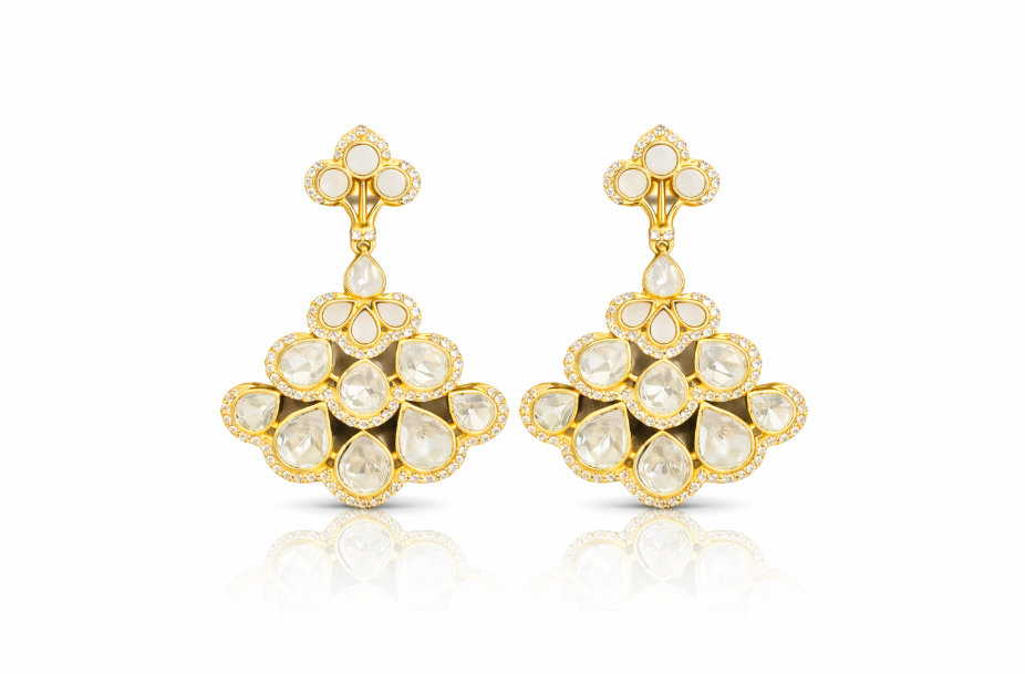 These graceful ear hangings feature three luminous mother-of-pearl round accents at the top, flowing into a beautifully layered arrangement of polki-style moissanite stones set in a gold-toned frame. Highlighted with subtle moissanite sparkle, the design offers timeless elegance—perfect for weddings, festive occasions, and sophisticated ethnic wear.