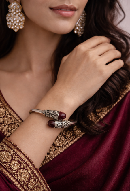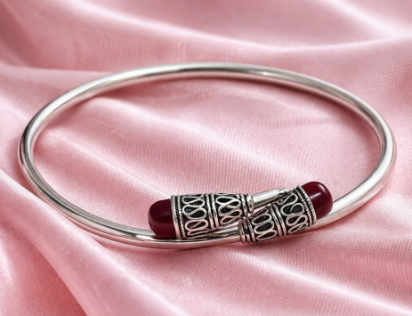 Elegantly designed with a touch of heritage, this silver bracelet features intricately carved end caps adorned with rich red stones that symbolize warmth and grace. The smooth circular band paired with detailed oxidized artistry creates a perfect balance of simplicity and statement—making it a versatile piece for both festive and everyday elegance.