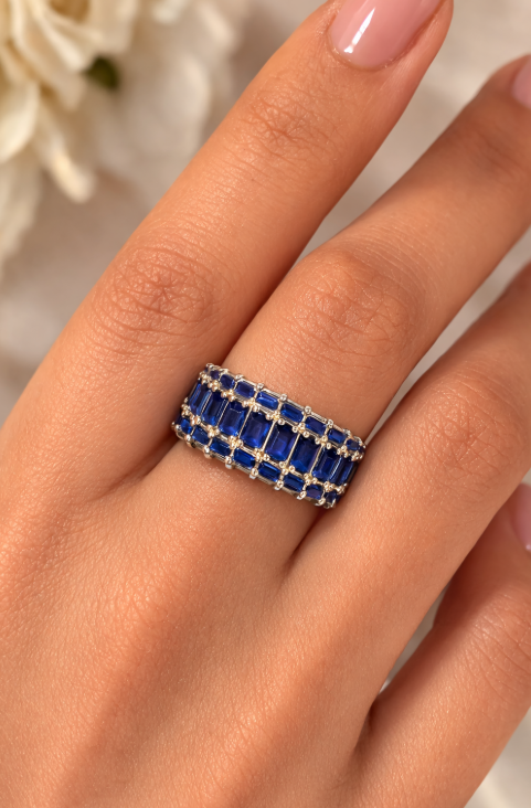 A striking expression of contemporary luxury, this wide eternity band ring showcases rows of deep blue baguette-cut Cubic Zirconia stones meticulously arranged in a geometric grid pattern. The structured setting and polished metal prongs create a beautiful balance of brilliance and architectural elegance. Designed to make a confident statement, this ring reflects refined craftsmanship and modern sophistication—perfect for elevating both everyday elegance and evening style.