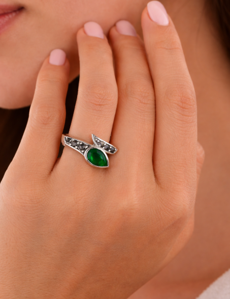 Delicate yet distinctive, this beautifully crafted silver ring features a captivating pear-shaped green Cubic Zirconia stone that draws the eye with its rich, luminous hue. The graceful bypass design symbolizes fluidity and harmony, while the finely set accent stones add a subtle sparkle, enhancing its vintage-inspired charm. Perfect for everyday elegance or special occasions, this ring is a timeless piece that effortlessly elevates your style.