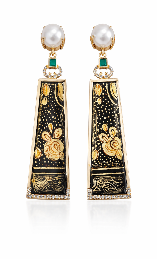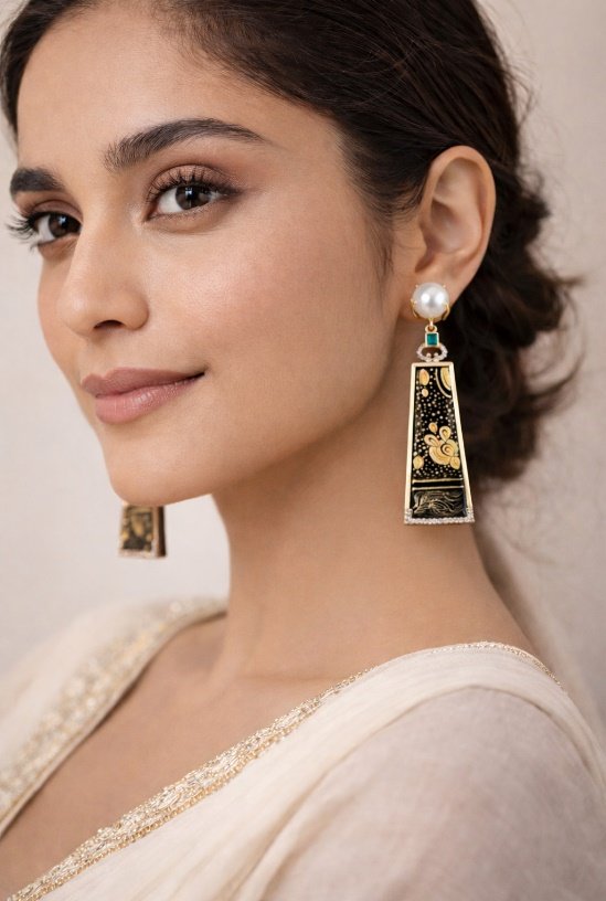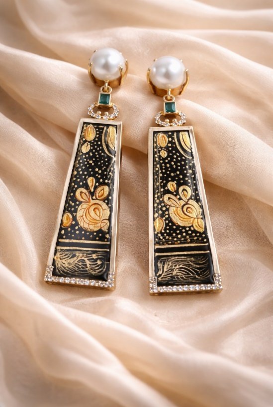These elegant ear hangings feature a hand-crafted ceramic panel adorned with intricate artistic detailing, finished with a rich gold foil overlay. Accented with shimmering moissanite stones and topped with a smooth ceramic cover, the design blends traditional artistry with refined luxury—perfect for statement festive wear and sophisticated ethnic ensembles.