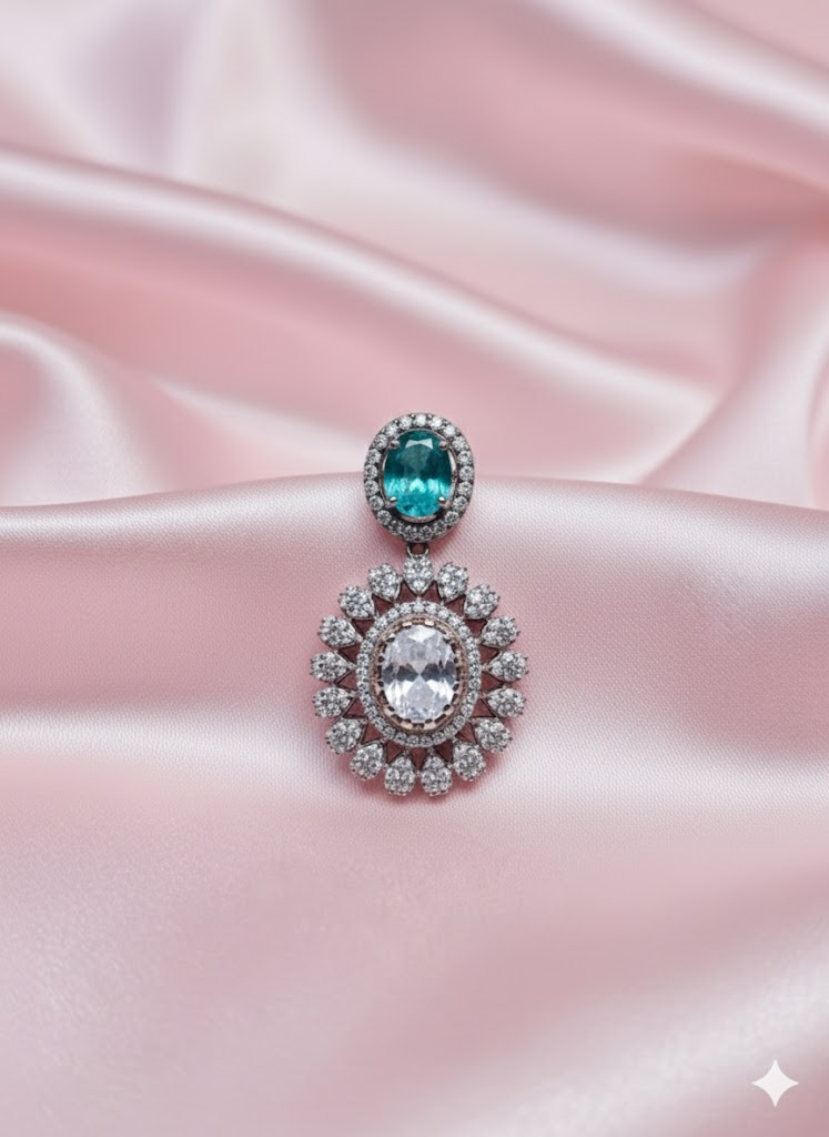 This elegant pendant features a vivid emerald-toned center moissanite stone crowned with a delicate diamond-style halo, flowing into a radiant floral drop of finely set stones. Crafted to reflect timeless sophistication, it adds a refined statement to both festive and evening ensembles.